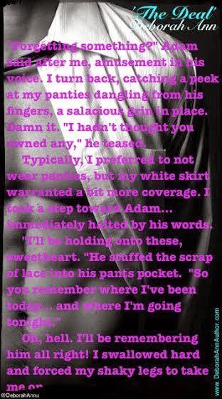 He strolled a little closer toward me, my heart picking up in its beat. I held my arm out in front of me to hold him back. Adam worked that impossible grin on me, making me want to yank on a belt loop and pull that shirtless body to me for another go round—this time on top of him. But I didn’t. “Seems we need to work out some details in our deal,” I said to him, my hand on his chest holding him back, a jolt of desire thundering through me from the touch. And, damn it, by the look in his eyes and that cocky grin, he knew it.